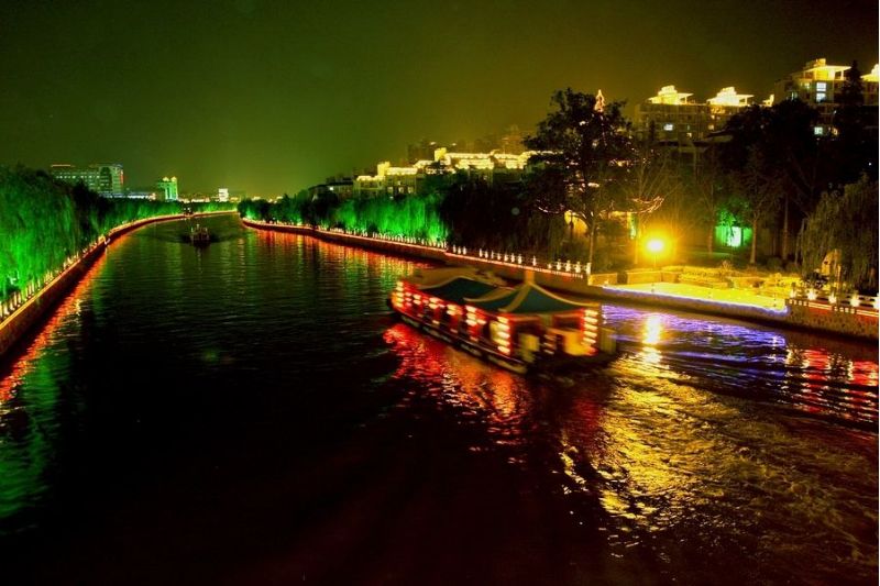 運河揚州段是大運河最古老的一段。可以說,沒有古運河,就沒有揚州古城,揚州古運河是揚州城的“母親河”,揚州也被認為是天下獨一無二的“運河城”。河水清澈,穿城而過,沿岸古跡林立,風土人情獨特有趣。在閃閃的燈光里,夜游揚州古運河,聯想到隋煬帝興建運河,想起他三下揚州賞花的故事,不禁感慨萬千。