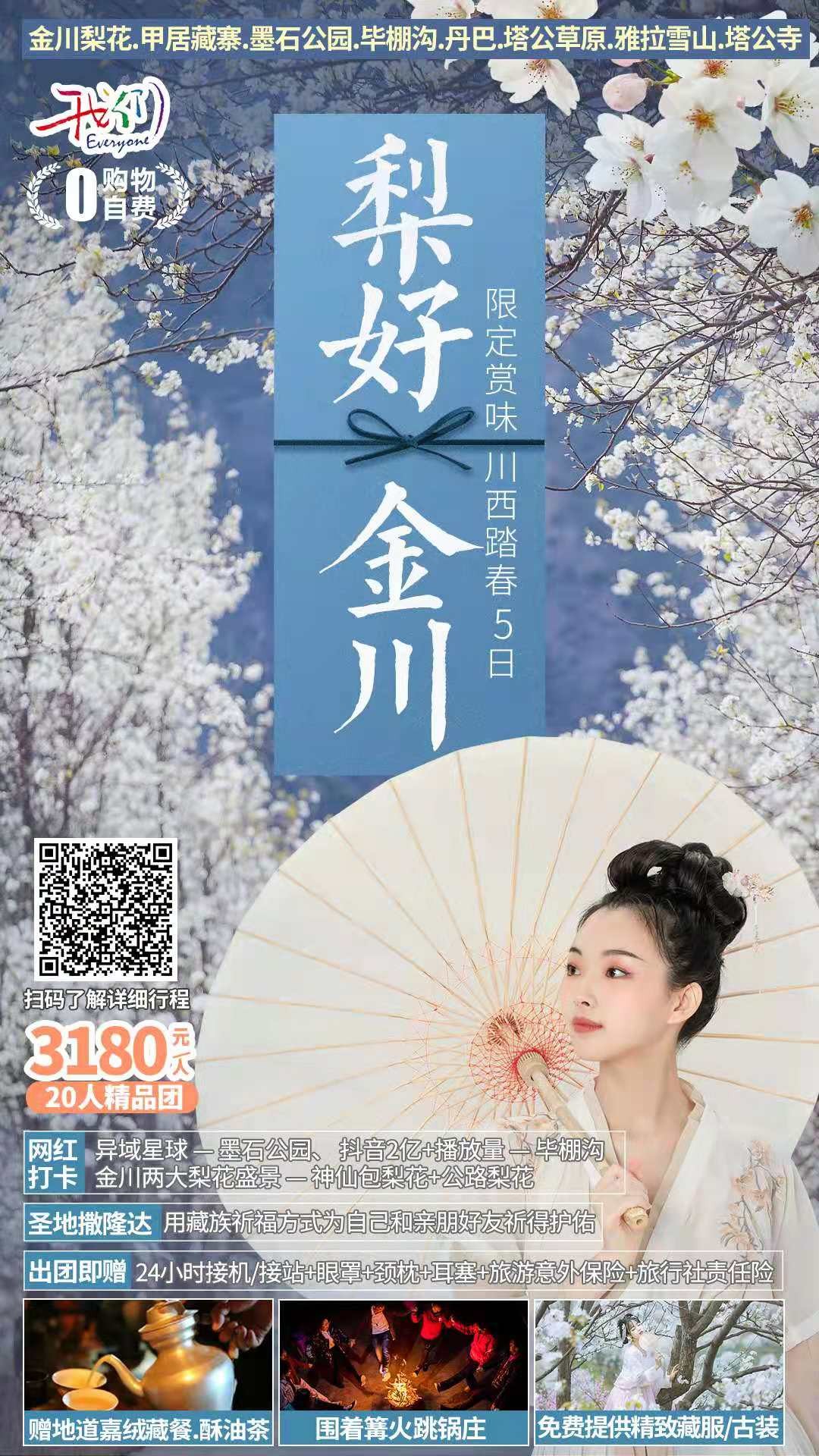我們的團期是金川最好的時節(jié),萬物復(fù)蘇的初春三月,正值金川成千上萬棵梨樹花期,雪白色的梨花競相開放,一片片、一層層的鋪散開來,漫山遍野的白色花海中夾雜零星新綠,空氣中氤氳著梨花清香,眼是天堂,身亦是天堂。