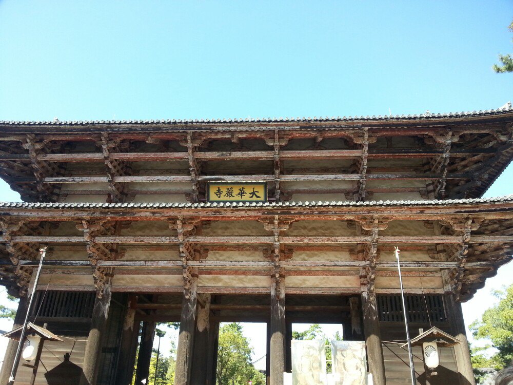 被稱為世界遺產的東大寺正門——南大門,寬約50米、高約25米。于760年建成但因為火災燒毀了,于鐮倉時期被修復重建。南大門設有高大威猛的金剛力士像(哞形像)。