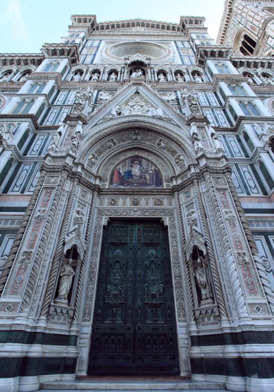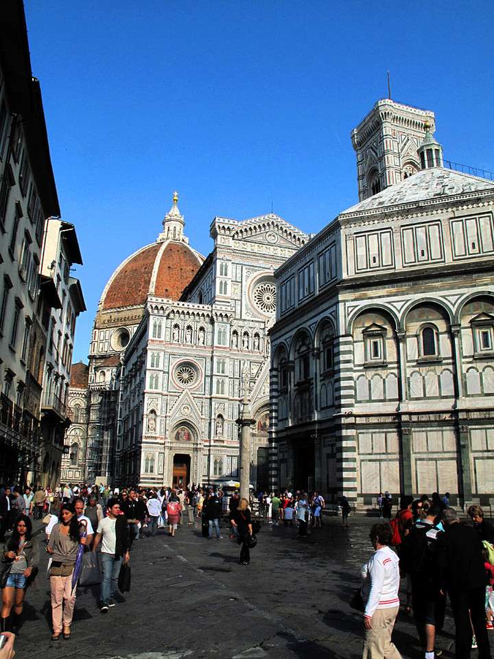 佛羅倫薩最著名的一組建筑——花之圣母大教堂(主教堂Basilica)、洗禮堂和鐘塔被緊緊包圍在Duomo廣場(chǎng)中心,人們要一直走進(jìn)廣場(chǎng),抬起頭來,才能看清主教堂的立面。廣場(chǎng)和周圍的街道,密密排著各色店鋪,人來人往,非常繁華。這組建筑群不像比薩 Pisa 的那樣仿佛是專門供人欣賞的陳列品,而是興高采烈地?cái)D在市民日常生活的漩渦之中。