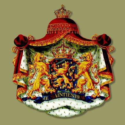 荷蘭國徽是一頂紅色貂皮懈”(Je Maintiendrai!)的藍色飾帶,兩只跨立的金獅翹著尾巴,口吐紅舌護著一面藍色盾徽。盾徽頂部是威廉一世御璽上所用的王冠;后面中央繪有一只頭戴王冠的金獅,右前肢揮舞著一把出鞘的利劍,左前肢揮動一束金色箭翎,它們象征著國王權力。華蓋如開啟的幕布,下部嵌有一條寫著威廉親王誓言“堅持不懈”。