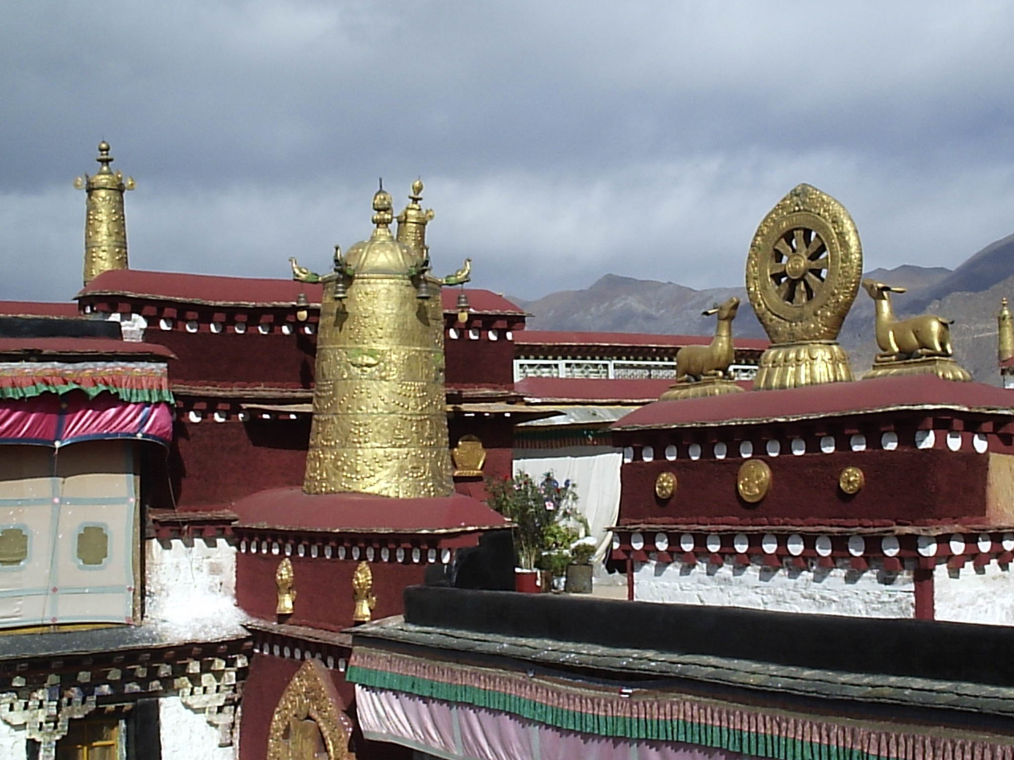 從庭院出來,回到側(cè)門的售票處,有樓梯可以直通二樓和三樓的平臺。二樓只在早上開放。松贊干布的法王殿也在二樓的西南角。里面供有藏王松贊干布、文成公主,尼泊爾尺尊公主、大臣祿東贊等塑像,也是早期的作品。二三樓之間有班丹拉姆護(hù)法神殿,這是大昭寺和整個(gè)拉薩城的護(hù)法女神。二樓天井的東北角有一個(gè)梯子,通向三樓的小門,是上金頂?shù)娜肟凇4蟮畹娜龢瞧綍r(shí)不對外開放,僧人們在這里打坐修行。頂層四座巨大的金頂分別建于14世紀(jì)中葉和17世紀(jì)。