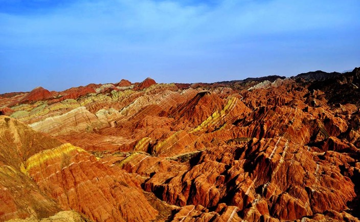 張掖丹霞地貌分布廣闊,場面壯觀,造型奇特,色彩艷麗,是我國干旱地區(qū)最典型和面積最大的丹霞地貌景觀,具有很高的科考價值和旅游觀賞價值。張掖的丹霞地貌集中分布在臨澤、肅南兩縣境內(nèi),面積達300多平方公里以上,是中國丹霞地貌發(fā)育最大最好、地貌造型最豐富的地區(qū)之一。層級錯落交替、巖壁陡峭、氣勢磅礴、形態(tài)豐富、色彩班斕而稱奇,有七彩峽、七彩塔、七彩屏、七彩練、七彩湖、七彩大扇貝、火海、刀山等奇妙景觀令人不得不贊嘆大自然的鬼斧神工。