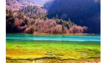 高瀑布是九寨溝最高的瀑布。站在五花海的頂部俯視其底部,那景觀妙不可言,湖水一邊是翠綠色的,一邊是湖綠色的,湖底的枯樹,由于鈣化,變成一叢叢燦爛的珊瑚,在陽光的照射下,五光十色,非常迷人。五花海有著“九寨精華”及“九寨一絕”的美名,站在五花海最高點,即老虎石上俯視,可一覽五花海全景。此處也是九寨溝最佳取景點之一。金秋時節,四周山坡上的彩葉紛紛墜落在池水中,倒影、水波、陽光、落葉的完美結合,將人間最絢爛的顏色糅合在五花海水中。 五花海是九寨溝的驕傲,從老虎嘴俯瞰,顏色好夸張,難道是有人打翻了阿拉伯神話中的藏寶箱?鋪張出一地豪華,亦或是孔雀翎織就的羽衣,拿是拿不走的,只好塞在記憶里。 犀牛海水下的色彩寧靜了許多,好像大自然進入了哲理狀態的思考,綿軟的水草只需輕輕抖動幾下腰身,就讓那藍和綠幻化出無限神秘;海拔最高的常海,已是一片冰封,壯美得肅穆。珍珠灘上的激流破冰而出,水流白中泛藍,銀中凝綠,更有大珠小珠落玉盤的韻味。夕陽照在海拔較低的蘆葦海上,搖曳出滿地金黃,仿佛在講述一個古老的故事。不時有水鳥從沼澤中撲簌簌飛起,原來,故事中的情節永遠都不會完結。