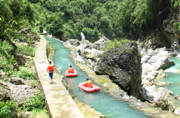 綠水清幽,山高谷深,內有奇峰怪石,懸崖磷澗,古樹奇花,狀若擎天的石筍,嬉戲的各類猴群在兩山群居,莊嚴的石佛穩坐中巖,深不可測的幾個溶洞,內藏奇特石鐘乳,使人觀不離步。河中有純天然無污染的黃魚、鯉魚、鯰魚、團魚。竹筏游需要3個多小時。其主要景點有滴水巖(水簾洞)、豬槽灣、美女秀腿、大佛巖、老虎洞砂壩、神弓射日等。