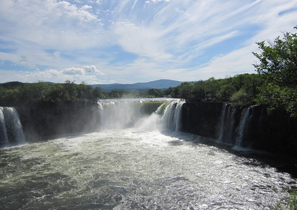 吊水樓瀑布,又稱鏡泊湖瀑布,它位于黑龍江省寧安縣西南,從牡丹江市向南經(jīng)古城寧安,再向西行抵達(dá)東京城后,從這里一直行駛30公里,便可抵鏡泊湖的北湖頭。瀑布幅寬約70余米,雨水量大時,幅寬達(dá) 300 余米。落差 20 米 。它下邊的水潭深 60 米 ,叫“黑龍?zhí)?rdquo;。每逢雨季或汛期,水聲如雷,激流呼嘯飛瀉,水石相擊,白流滔滔,水霧蒸騰出繽紛的彩虹。它形狀好像加拿大亞尼亞加拉大瀑布,是世界最大的玄武巖瀑布。