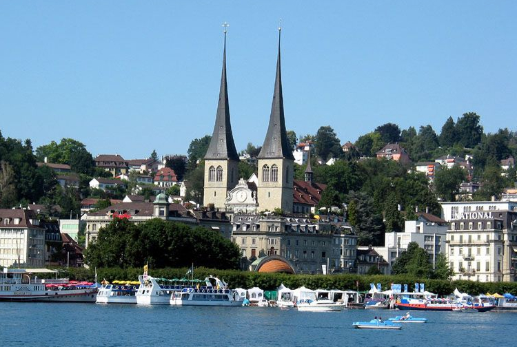 有兩座美麗尖塔的豪夫教堂(Hofkirche),位于盧塞恩湖的北面,是盧塞恩最重要的教堂。公元735年開始建造,是羅馬式建筑,到14世紀改建為哥特式,17世紀的一場大火中受到了嚴重破壞,隨后又改建為文藝復興式。教堂內部莊嚴肅穆,禮拜席上有生動細膩的雕刻圖案。教堂的管風琴,1640年制造,共有4950根風琴管,至今仍在盧塞恩的夏季音樂節(jié)上使用。