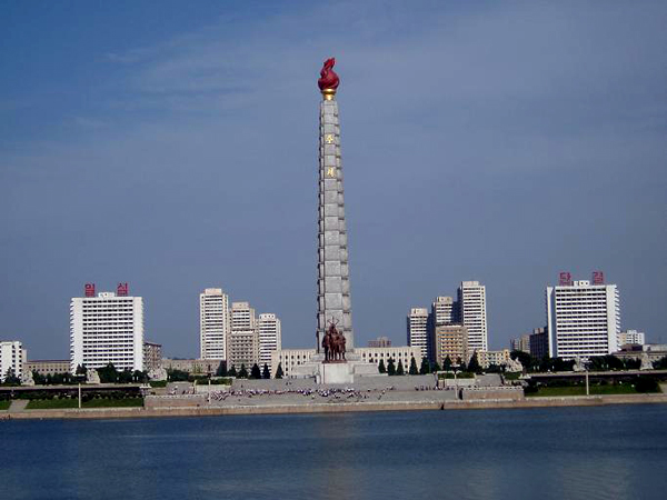 主體思想塔(????? Juche Tower) 位于朝鮮民主主義人民共和國首都平壤市市中心的大同江畔,是為祝賀金日成七十壽辰而建的,塔及其周圍附屬建筑占地總面積15萬平方米。1982年4月15日竣工揭幕。主體思想塔是金日成主席創(chuàng)立的“主體思想”的象征。塔的正面,建有高30米、重33噸的象征工人、農(nóng)民、知識分子的三人群像,左右是以“主體工業(yè)”、“豐年”、“學(xué)習(xí)之國”、“無病長壽”、“主體藝術(shù)”、“銅墻鐵壁”為主題的花崗巖群像。